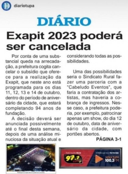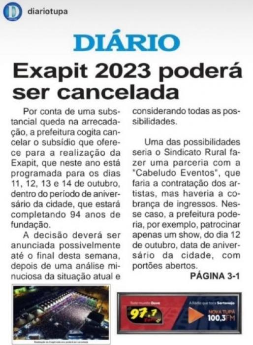 A Comissão Organizadora da EXAPIT, a Feira Agropecuária de Tupã, estuda a possibilidade de cancelamento do evento deste ano.