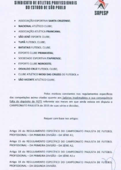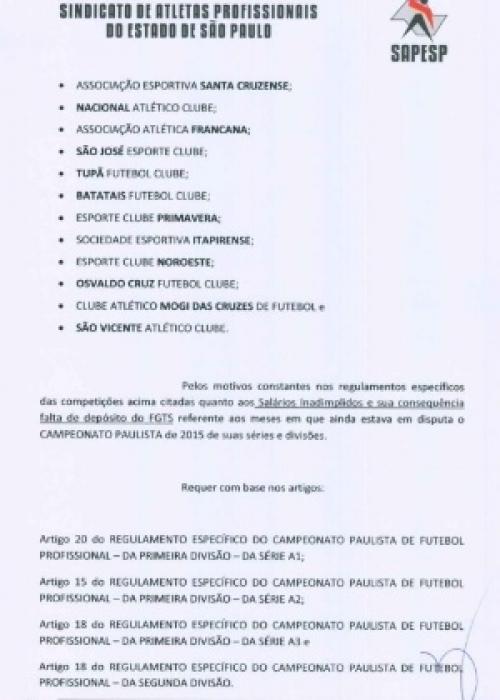 As dívidas acumuladas fizeram a diretoria do Osvaldo Cruz pedir desligamento do clube do torneio estadual. A denúncia feita pelos atletas chegou ao Sindicato dos Atletas de São Paulo (Sapesp), que encaminhou um documento à Federação Paulista de Futebol exigindo punição ao clube. O Osvaldo Cruz corre risco de perder pontos e ser eliminado do torneio. O Sindicato também pede para que os clubes com débito sejam impedidos de participar do Paulistão de 2016.