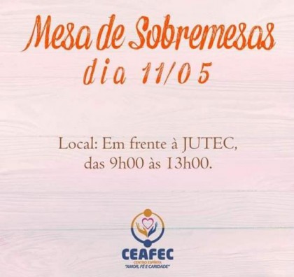 OSVALDO CRUZ - O Centro Espírita "Amor, Fé e Caridade" realiza no próximo sábado, 11, a partir das 9 horas Mesa de Sobremesa na avenida Brasil, centro da cidade, defronte à Loja Jutec Tecidos.