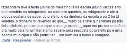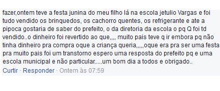 Segundo o reclamante, "muitos pais tiveram que ir embora porque não tinham dinheiro para compra tudo o que as crianças queriam. O que era para ser uma festa, para muitos pais foi um transtorno", afirmou Pedro Lima ao acrescentar que espera uma resposta do prefeito, visto tratar-se da Escola Getúlio Vargas ser uma escola pública e não particular (vide reclamação ao lado).