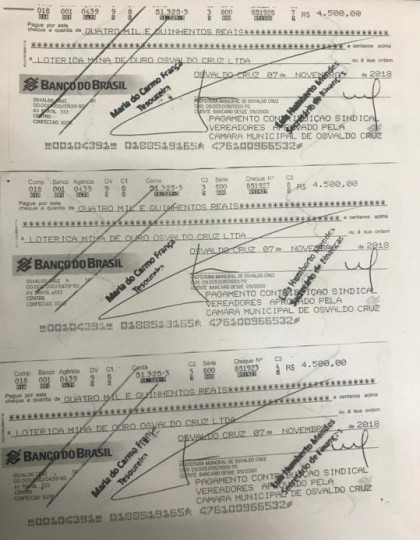 Os títulos, com data desta quarta-feira (7), são grafados como suposto pagamento de "Contribuição Sindical Vereadores Aprovado pela Câmara Municipal de Osvaldo Cruz", o que é inexistente.