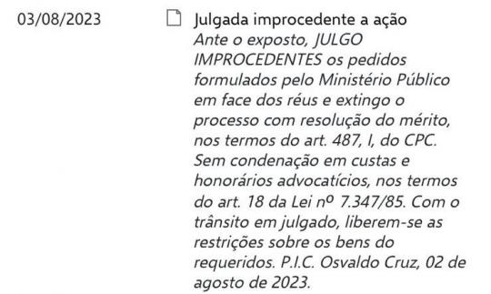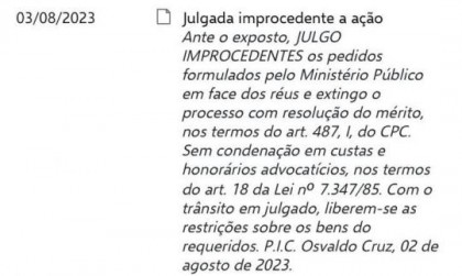 OSVALDO CRUZ - A Justiça absolveu em primeira instância o ex-Prefeito VALTER LUIZMARTINS, o ex-secretário de governo ENER ALVES DA CUNHA e os funcionários municipais WILMA KOSICKI RIBEIRO, CÁSSIA ANDREIA GIMENES OTOBONI LUIZ, THELMA BUASSALI MAGNANI, APARECIDOFERNANDES BARBOSA, ROBERTO MAZZONI SILVA, FÁBIO RENATO BANNWART e ainda a CONSTRUTORA CALIFÓRNIA OSVALDO CRUZ LTDA., EVANDRO CALARGA e IRENE NERY CALARGA.