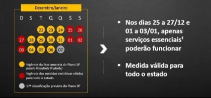 Nos demais dias, todo o Estado continua na fase amarela, a terceira das cinco estipuladas pelo Plano São Paulo.