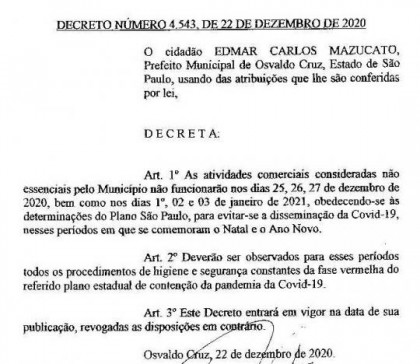52331Prefeitura de Osvaldo Cruz segue decreto estadual e determina fechamento de setores não essenciais nas festas de fim de ano
