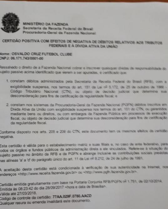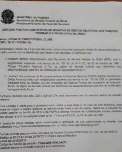 OSVALDO CRUZ - A gestão do Osvaldo Cruz F.C. é algo que deveria ser a regra no futebol brasileiro, mas torna-se exceção pelo cumprimento de suas obrigações tribuntárias e trabalhistas.