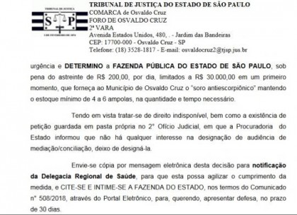 46738Promotoria consegue decisão judicial e garante estoque de soro contra picadas de escorpião na Santa Casa de Osvaldo Cruz