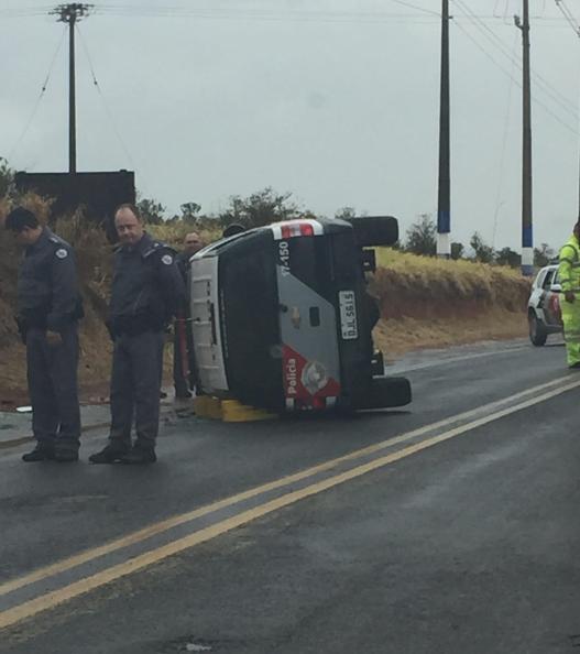 OSVALDO CRUZ - Uma viatura da Polícia Militar tombou próximo ao trevo de acesso a SP-294, a Rodovia Comandante João Ribeiro de Barros (SP-294) na vicinal Roberto Romanini,que liga Osvaldo Cruz a Salmourão.