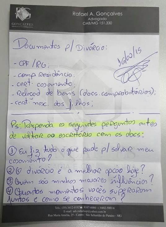 Fiz um pequeno questionário após solicitar os documentos e pedi que a moça respondesse as 4 perguntas a si mesma. Se após responder e analisar a situação com calma, longe do turbilhão de informações que estava lhe passando pela cabeça naquele instante, ainda assim resolvesse se divorciar, que bastava me trazer a documentação e eu botaria um fim naquela história!