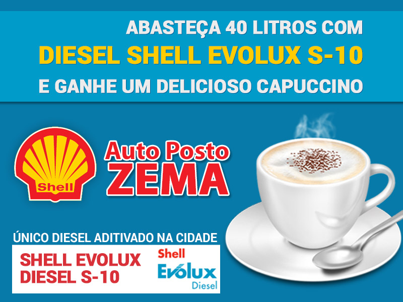 OSVALDO CRUZ - O Posto Zema Shell presenteia seus clientes com um delicioso capuccino. Basta abastecer com 30 litros de gasolina V Power ou 40 litros do Diesel Evolux S-10 e pronto!