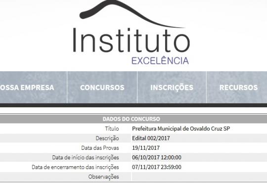 O edital completo e respectivas retificações estão anexados no quadro de avisos da Prefeitura Municipal de Osvaldo Cruz-SP e nos sites www.institutoexcelenciapr.com.br e www.osvaldocruz.sp.gov.br.