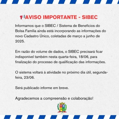 SIBEC segue em manutenção para incorporar novos dados do Cadastro Único; previsão é retornar ao funcionamento na segunda-feira (23/06)