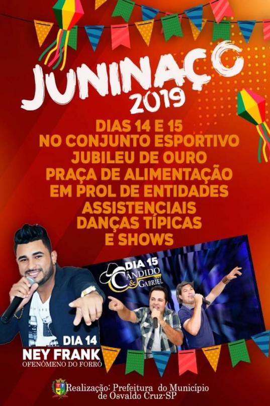 OSVALDO CRUZ - Como parte do programa de Aniversário de 78 anos de Fundação de Osvaldo Cruz, nas próximas sexta-feira (14) e sábado (15) sempre a partir das 19h30, no Conjunto Esportivo “Jubileu de Ouro” acontecerá o Juninaço 2019.