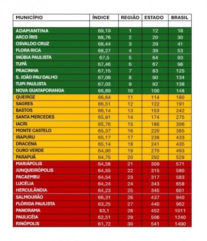 Entre as 30 cidades vinculadas à Associação dos Municípios da Nova Alta Paulista o ranking é o seguinte com posicionamento em nível estadual e nacional e mais a nota do IPS, vide quadro ao lado.