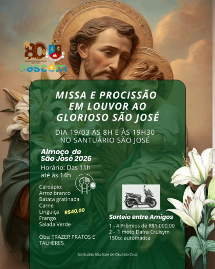 Já o tradicional Almoço de São José será realizado das 11h às 14h, com cardápio que inclui arroz branco, batata gratinada, carne, linguiça, frango e salada verde. O valor é R$ 40.