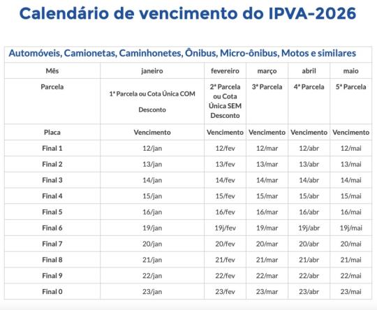 Placa Final 6: Os vencimentos são nos dias 19 de cada mês, de janeiro a maio.