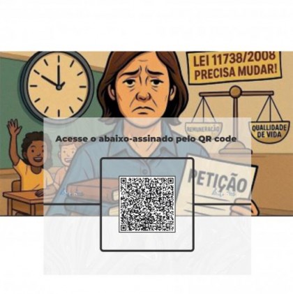 Aponte a câmera do seu celular ou tablet no QR Code ao lado para assinar o abaixo assinado para a redução da jornada de trabalho dos professores para 30 horas semanais.