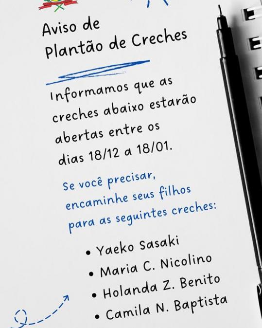 A Secretaria de Educação do Município de Osvaldo Cruz informa que, a partir de 18 de dezembro até 19 de janeiro de 2024 implantará um sistema de plantão nas seguintes creches municipais: “Camila Nabas Baptista”, “Maria Coltri Nicolino”, “Holanda Zocatelli Benito” e “Yaeko Sasaki”.