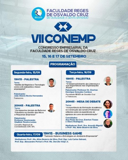 OSVALDO CRUZ - Os Cursos de Administração e Ciências Contábeis promovem neste mês de setembro o “VII CONEMP”, Congresso Empresarial da Faculdade REGES de Osvaldo Cruz. O evento, que será realizado entre os dias 15 e 17 deste mês, contará com a participação de estudantes, professores da Instituição e profissionais de áreas relacionadas, assim como empresários e consultores da região, além da comunidade em geral.