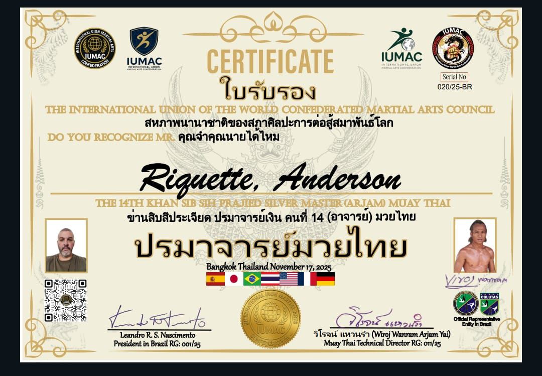A International Union of the World Confederated Martial Arts Council (IUMAC) concedeu ao professor de Muay Thai brasileiro, o osvaldo cruzense, Anderson Riquette a certificação internacional de 14th Khan Sib Sib Prajied – Silver Master (Arjam Muay Thai), um dos reconhecimentos mais elevados dentro da hierarquia técnica da modalidade.