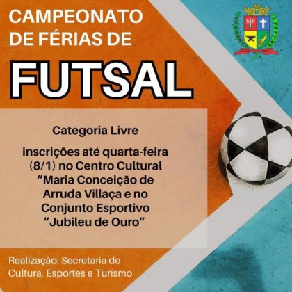 OSVALDO CRUZ - A Secretaria Municipal de Cultura, Esportes e Turismo reforça a reta final das inscrições para o Campeonato de Férias de Futsal Masculino Categoria Livre. Podem participar atletas acima de 15 anos.