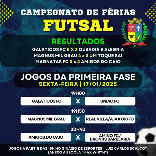 As partidas serão no Ginásio de Esportes Luiz Carlos Scalco (anexo à Escola Municipal Max Wirth).