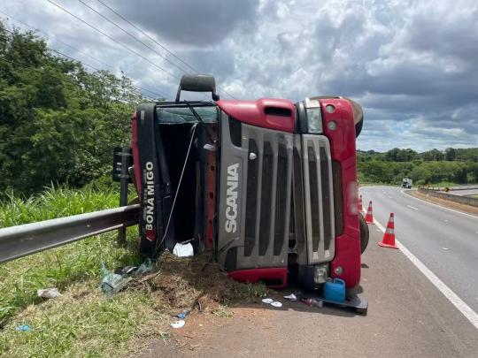 Um caminhão carregado com óleo vegetal tombou, na manhã deste domingo (18), próximo à entrada do Parque Ecológico da Cidade da Criança “Agripino de Oliveira Lima Filho”, na Rodovia Raposo Tavares (SP-270), em Presidente Prudente (SP).