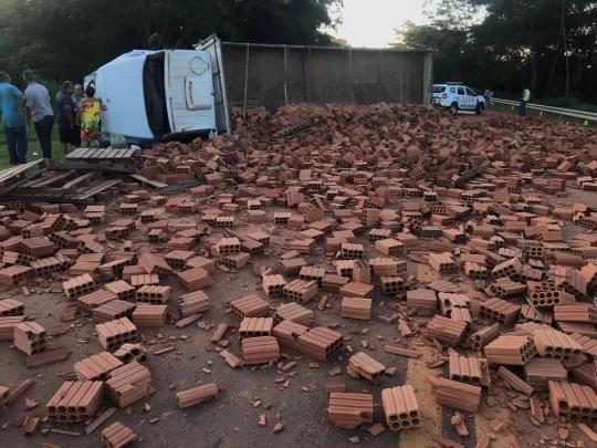 59430Caminhão carregado com tijolos tomba próximo a Flórida Paulista