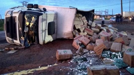 Devido tombamento, o baú do caminhão danificou e grande parte da carga de ovos que estava no veículo caiu sobre o local do acidente. Felizmente o motorista não ficou ferido, somente danos matérias.