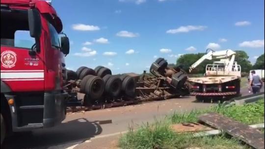 TUPI PAULISTA - Um caminhão que transportava materiais recicláveis tombou na manhã desta quinta-feira (5) na Rodovia General Euclides de Oliveira Figueiredo (SP-563), a Rodovia da Integração, em Tupi Paulista. De acordo com as informações do Corpo de Bombeiros, o motorista ficou preso nas ferragens após o veículo tombar no canteiro central.