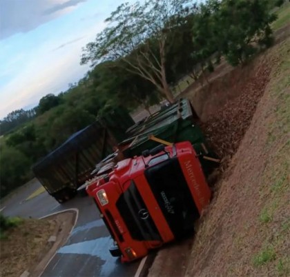 O veículo seguia pelo trevo e quando ia acessar a rodovia, o cavalo mecânico e o primeiro módulo tombaram esparramando parte da carga.