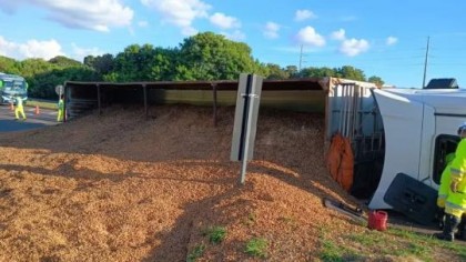 66116Carreta carregada com toneladas de amendoim tomba em Tupã