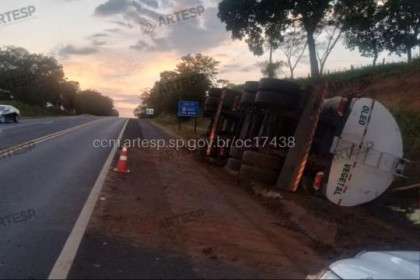 JUNQUEIRÓPOLIS - Uma carreta carregada com óleo vegetal tombou na Rodovia Comandante João Ribeiro de Barros (SP-294), na altura do km 635, em Junqueirópolis (SP), na madrugada desta quinta-feira (4). O motorista sofreu ferimentos leves.