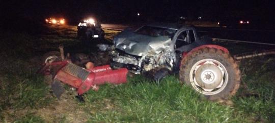 Ao desviar, bateu contra um trator.