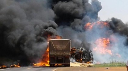 A equipe de reportagem está no local, más as primeira informações são de que um dos motoristas ficou preso às ferragens da cabine e morreu. O acidente envolveu dois caminhões, um deles tanque que está em chamas.