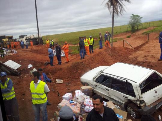 De acordo com as primeiras informações, trata-se de uma colisão entre um caminhão com carga alimentícia e um carro.