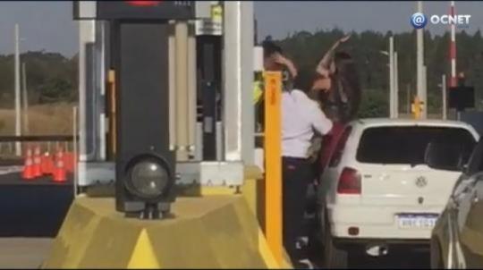 Uma testemunha disse que, não contente, o homem avançou com o carro, parou na área fora do pedágio e voltou para continuar com a briga, desistiu e foi embora.