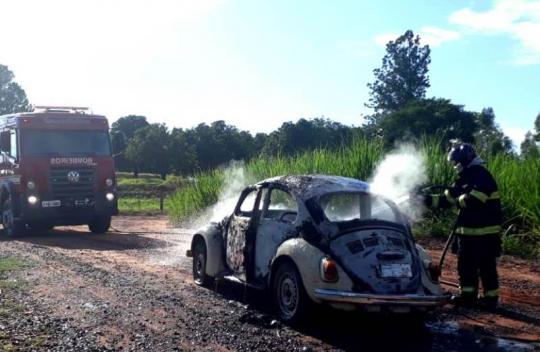 REGIONAL - O proprietário de um VW Fusca teve seu carro destruído pelo fogo na vicinal que liga Sagres a Pracinha nesta quinta-feira (2).