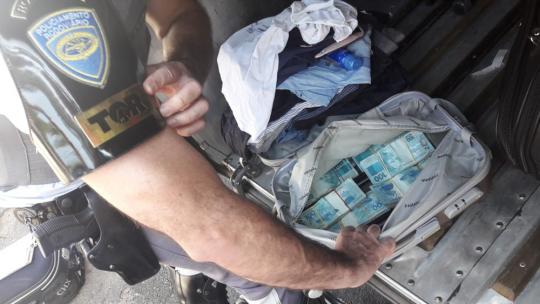Ao realizarem uma vistoria no bagageiro externo do veículo, os militares localizaram em uma mala de propriedade do indiciado uma grande quantidade de dinheiro em espécie, em notas de R$ 100, sem declaração de origem.