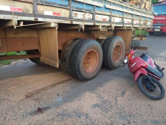 Ainda de acordo com os bombeiros, um caminhão que carregava madeira estava saindo da rotatória quando o motociclista bateu em um dos eixos do veículo.