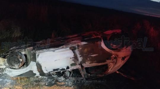 O carro teria colidido contra um barranco, capotado e em seguida pegou fogo. O condutor estava dentro do automóvel e não conseguiu sair.