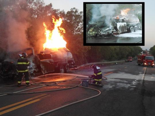 LUCÉLIA - Um caminhão de combustível e um carro pegaram fogo após colidirem frontalmente no km 587 da SP-294 (rodovia Comandante João Ribeiro de Barros), em Lucélia.