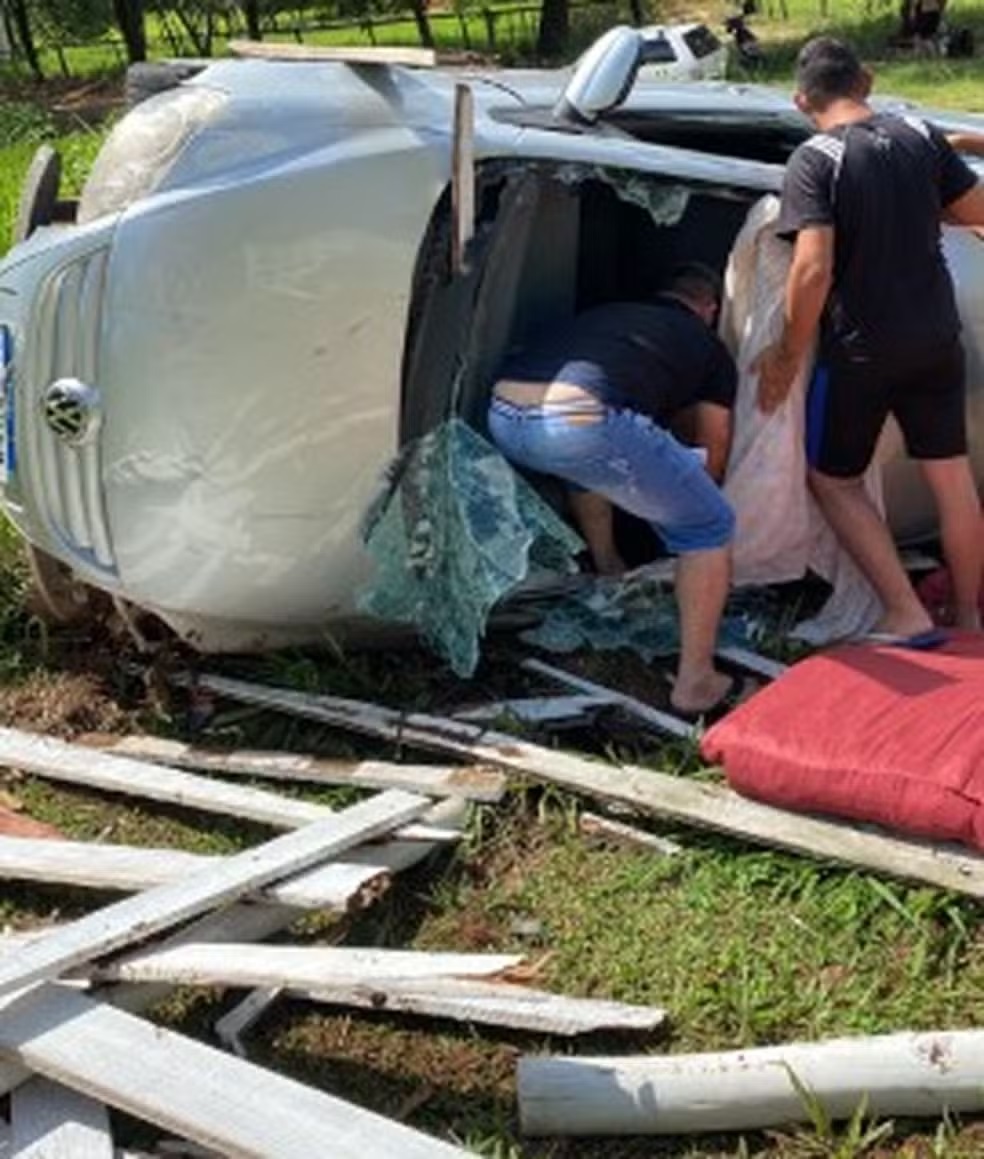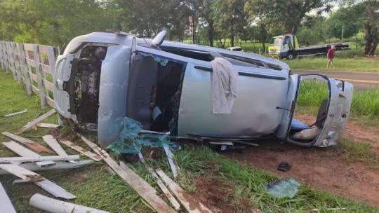 Carro capotou e ainda atingiu uma cerca de madeira de uma propriedade rural.