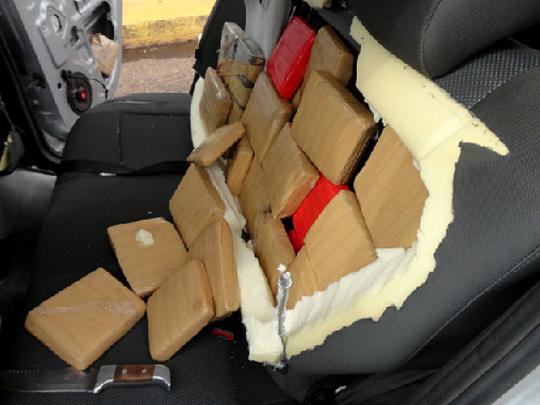 No automóvel, um Fox com placas de Imperatriz (MA), estavam três homens. Em busca veicular, os policiais localizaram 54 tijolos de maconha, que estavam escondidos no interior dos bancos dianteiros e traseiros e também nas laterais das portas de trás.