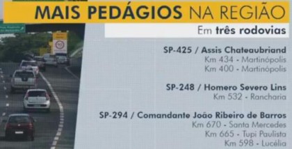 Já na Rodovia Comandante João Ribeiro de Barros (SP-294) haverá três praças: uma em Lucélia (Km 598), outra em Tupi Paulista (Km 665) e mais outra em Santa Mercedes (Km 670).