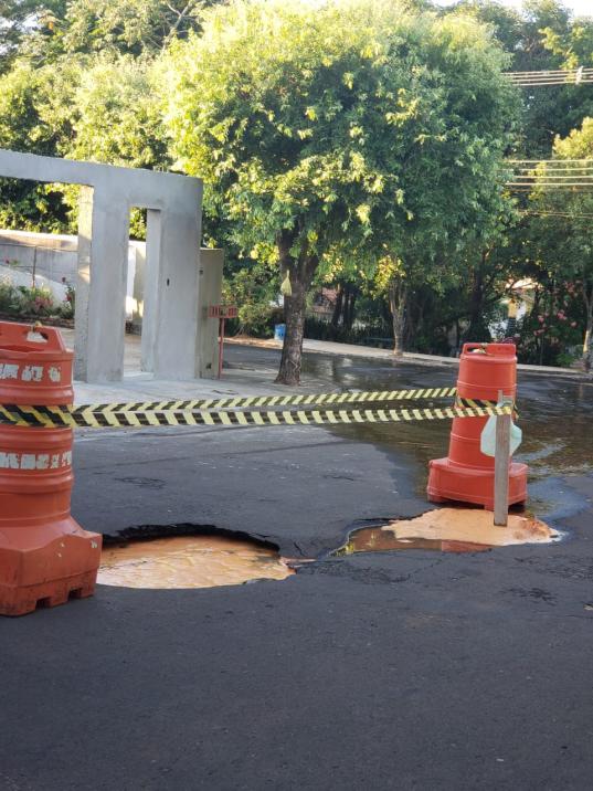 Os cidadãos relataram que há dois dias perceberam vazamentos pelo asfalto e que após um caminhão passar pela rua houve a abertura de dois buracos e que o vazamento aumentou.