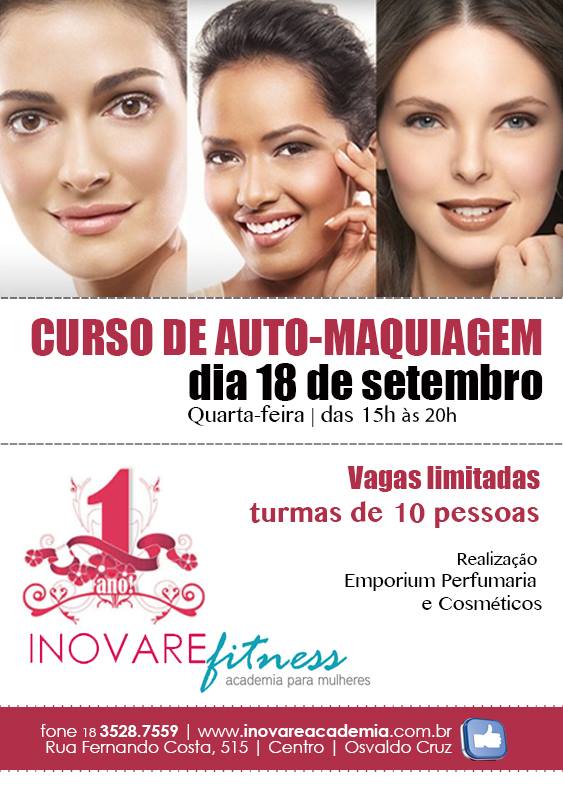 Faça sua inscrição para o Curso de Auto Maquiagem com a equipe da Emporium e produtos Mary Kay. Horário das 15h às 20h. As turmas serão de no máximo 10 pessoas.