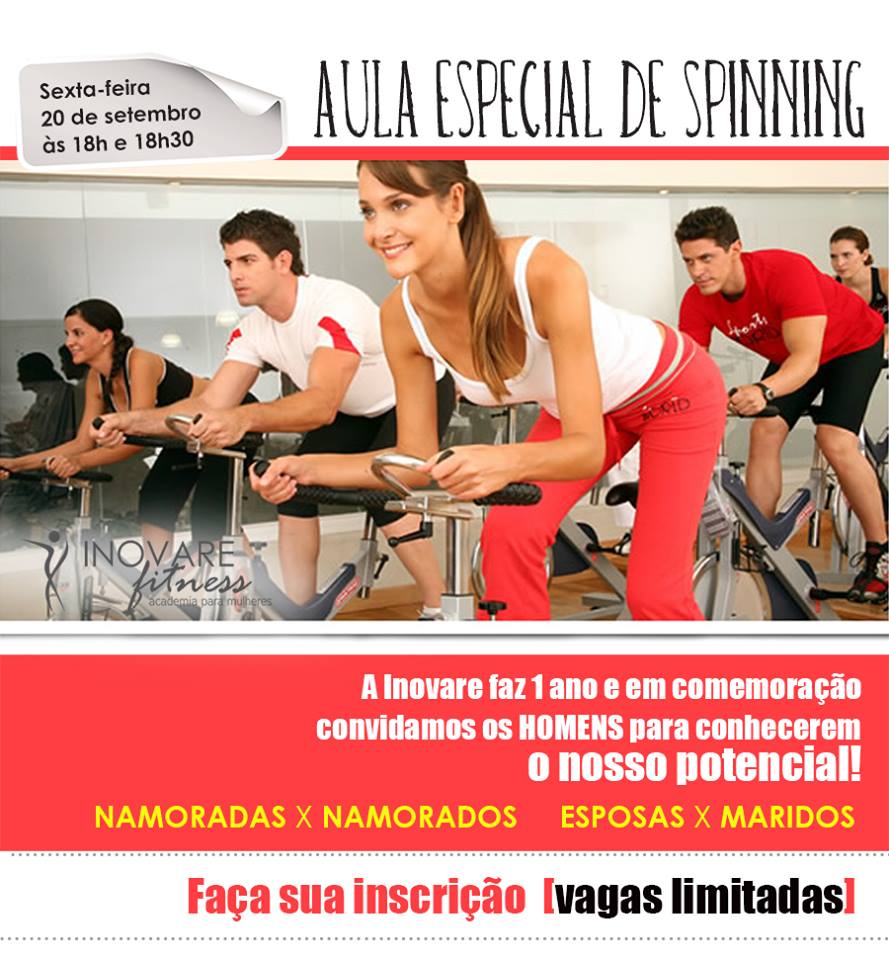 Faça sua inscrição para a aula especial de Spinning namoradas x namorados, maridos e mulheres que acontecerá sexta-feira, 20, primeira aula as 18h e a segunda aula as 18h30.