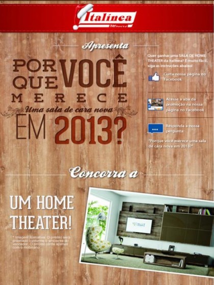 A Italínea Industria de Móveis lança a promoção “Porque você merece uma sala de cara nova em 2013” e concorra a um Home Theater! O prêmio será projetado conforme o ambiente do vencedor.
