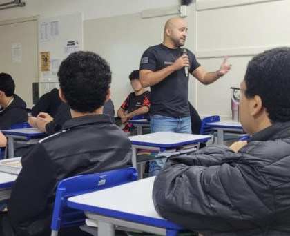 Durante a palestra, os alunos puderam interagir com o delegado Vinícius Rocha Prado, que esclareceu dúvidas sobre os procedimentos da Polícia Civil, as consequências legais de atos infracionais e o papel da DDM na rede de proteção.