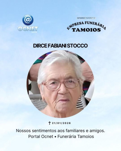 É com profundo pesar que comunicamos o falecimento da Sra. Dirce Fabiani Stocco, ocorrido na quarta-feira, 21 de janeiro de 2026, na cidade de Osvaldo Cruz (SP).